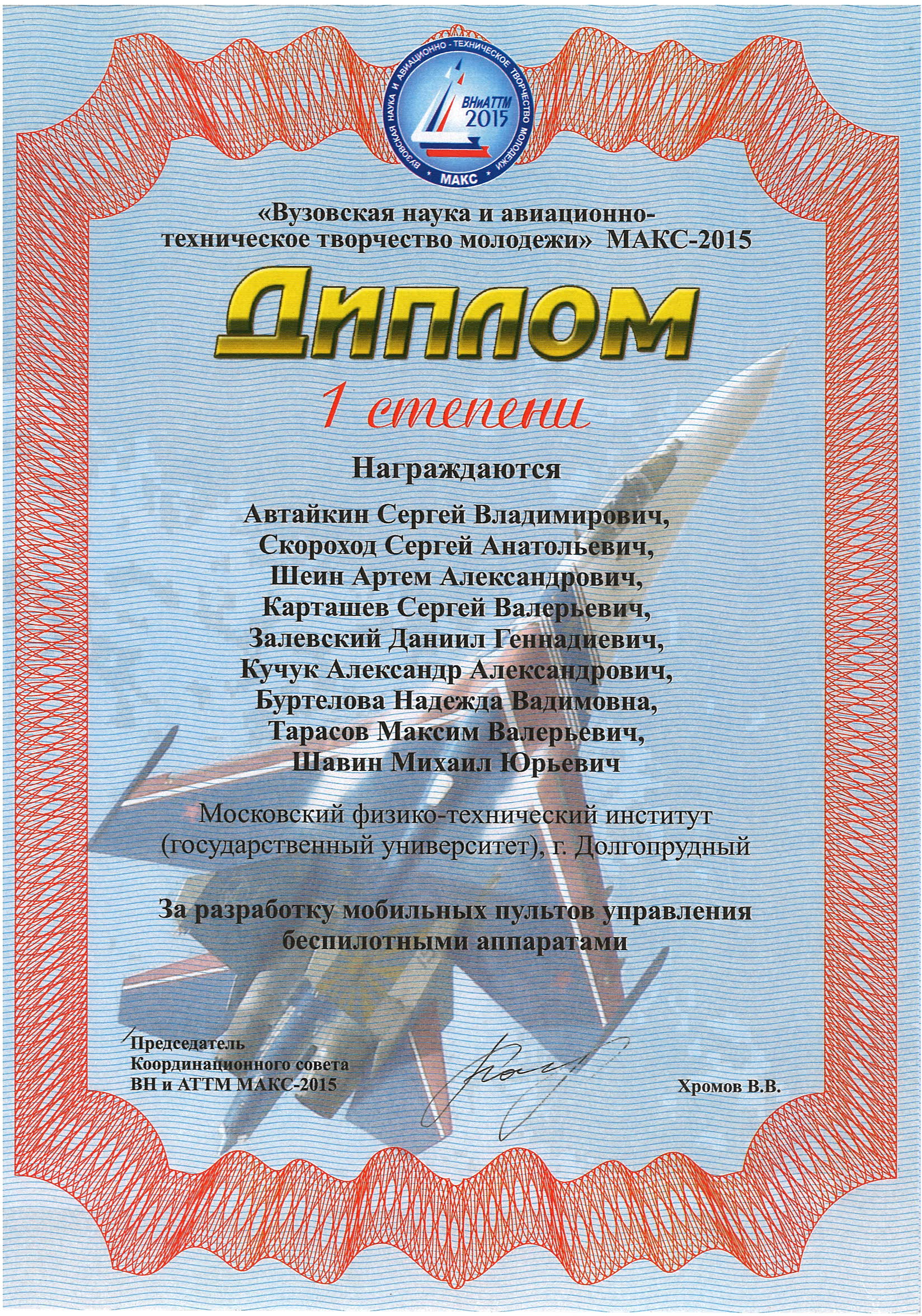 В воскресенье 30 августа на закрытие секции «Вузовская наука и авиационно-техническое творчество молодежи» МАКС-2015 наша лаборатория получила диплом первой степени за разработку мобильных пультов управления беспилотными аппаратами (проект «Наземка»).